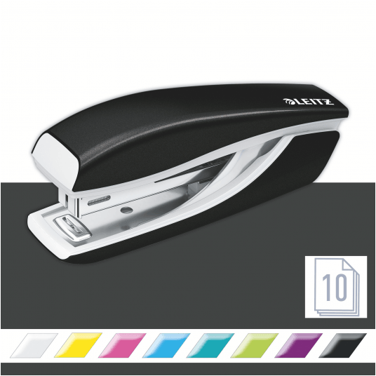 Niewielki, poręczny zszywacz w wyrazistych kolorach WOW do użytku w biurze, w domu i podczas podróży. - zszywa do 10 kartek (papier 80 gsm) - precyzyjne zszywanie dzięki technologii Direct Impact - otwarcie 180° umożliwia zszywanie tapicerskie - do zszywek Leitz Power Performance P2 No. 10, opakowanie zszywek w komplecie - poręczny zintegrowany rozszywacz - 10-letnia gwarancja przy stosowaniu zszywek Leitz oraz certyfikat bezpieczeństwa GS - kompaktowy rozmiar ułatwia używanie w czasie podróży - kolor: czarny metaliczny.