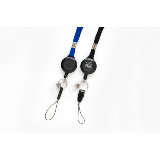 - na końcu czarny mechanizm ściągający z metalowym karabińczykiem umożliwiający wyciągnięcie identyfikatora na odległość, klips i zawieszka (pętelka mocująca)