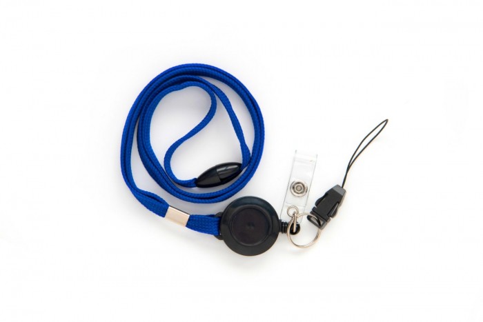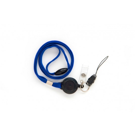 Taśma wypinająca z mechanizmem ściągającym, klipsem i zawieszką w kolorze niebieskim.