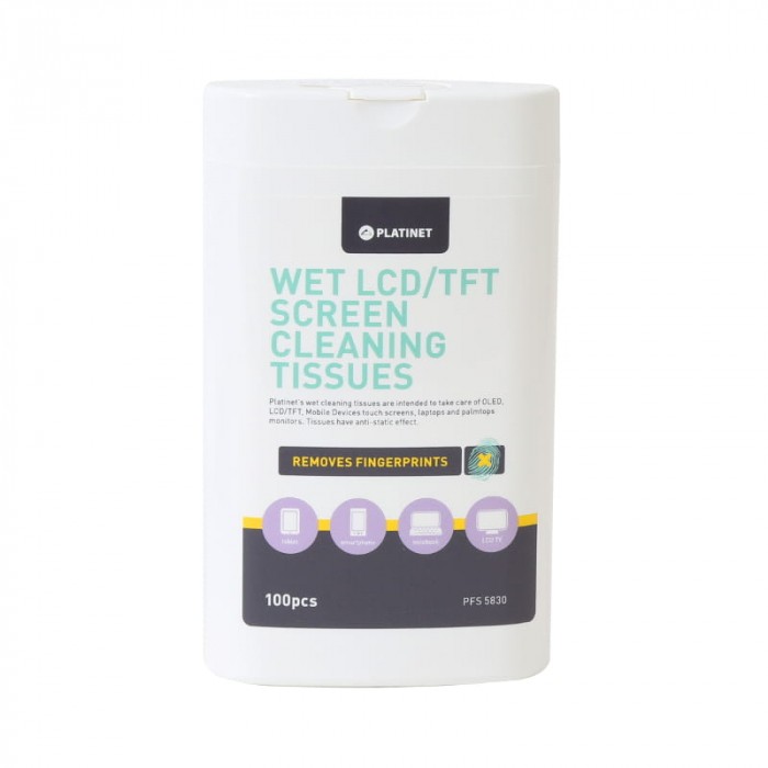 Chusteczki czyszczące do monitorów TFT/LCD. 100 nawilżanych chusteczek marki Platinet idealnie nadających się do czyszczenia monitorów i telewizorów LCD/TFT. Usuwają tłuste plamy, odciski palców i inne zanieczyszczenia, jednocześnie są bezpieczne i nie uszkadzają ekranu. Pozostawiają antystatyczną powłokę zabezpieczającą przed ponownym osadzaniem się brudu.