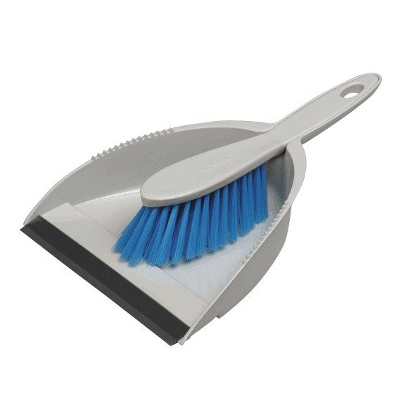 Szufelka ze zmiotką: Kolor: Szary; Typ włosia: PET; Szufelka zakończona gumową listwą wykańczającą.