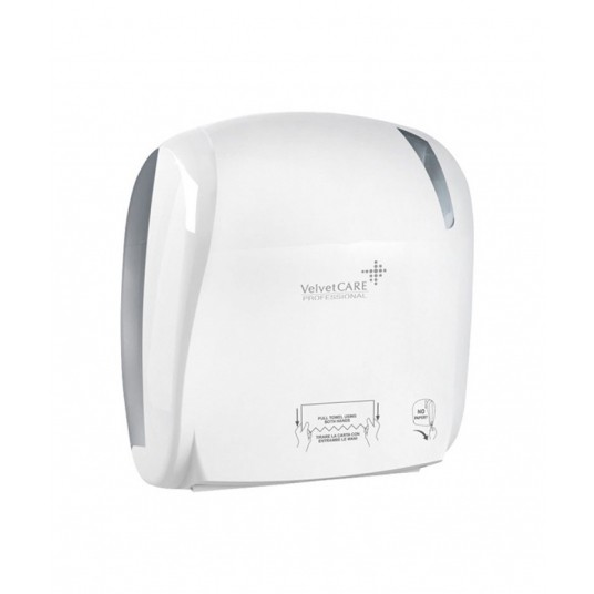 podajnik do ręczników Velvet 150m każde pociągniecie ręcznika dozuje 27cm. przy 150m rolce jest to 555 „listków” wymiary produktu (wys/gł/szer): 371x221x330 mm waga: 2,7 kg materiał ABS (osłona), MABS (spód i okno) kolor: biały zasilanie mechaniczne